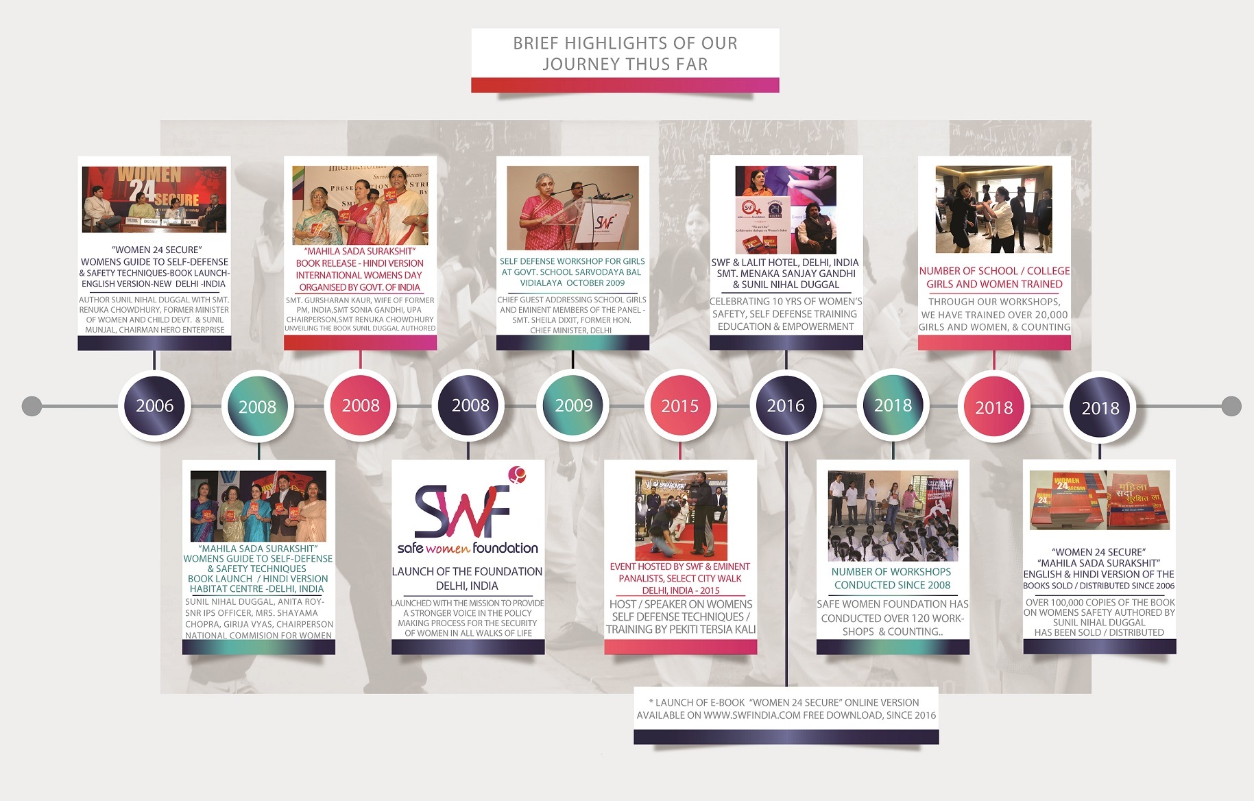 Safe Women Foundation (SWF), an NGO registered as a Society with Government of India under the Registration of Societies Act of 1860, was established in the year 2008 for the personal safety of women through organizing and conducting Self Defense Workshops for women employed in the corporate se...